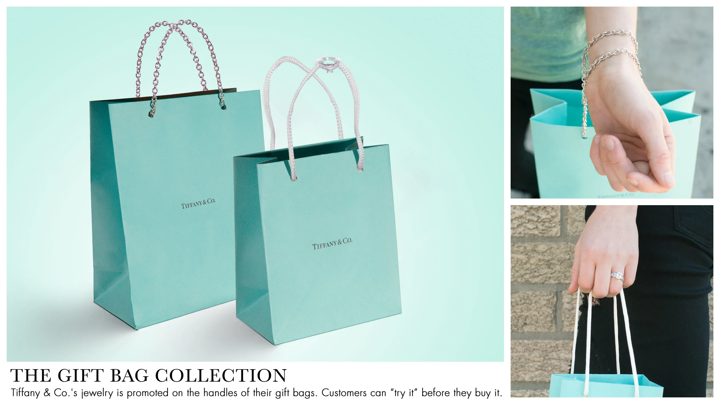 Tiffany & Co.'s jewelry is promoted on the handles of their gift bags. Customers can "try it" before they buy it.